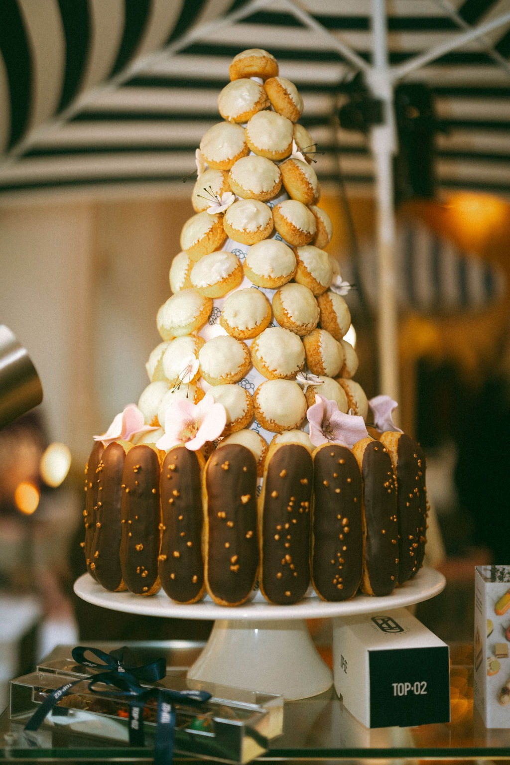 Modern, French, colourful patisserie art of the highest quality was also presented and offered for sale at „Tartufo Totale“. There were truffles in marvellous varieties, eclairs, tartelettes, choux, macarons, pralines, etc. Eyes & salivary glands overflow with the handmade master desserts. The signature cake was also a beguiling eye-catcher: The Pièce Montée, also known as Croquembouche.